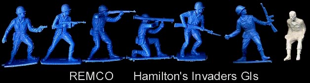 Remco made a vehicle driver and six foot soldiers for their Hamilton Invader sets. The figures are about 60mm in size. The seated vehicle driver was made in white and the foot soldiers are usually found in blue. The foot soldiers are also found in red, perhaps for sale in Canada.