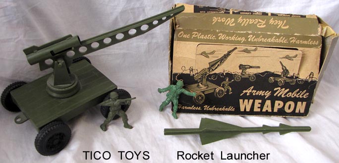 Rocket Launcher. Has original box that is in poor shape. Spring shooting rocket works + 2 copies of LIDO GIs. 1950s era.