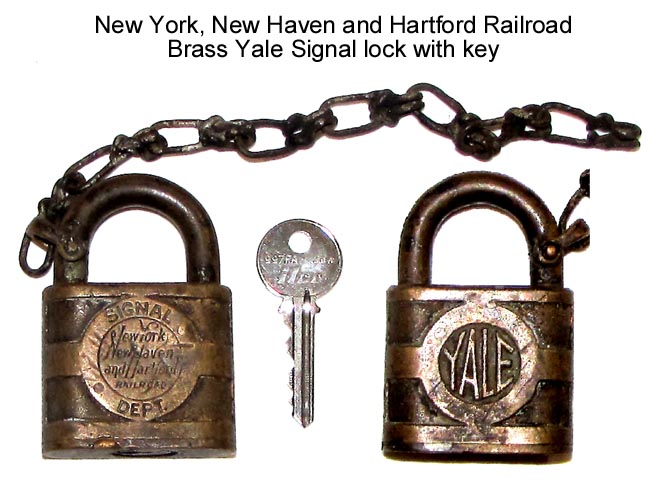 - NEW YORK, NEW HAVEN AND HARTFORD RAILROAD cast/incised on one side, YALE cast on other side, brass signal lock, has working key, has chain.