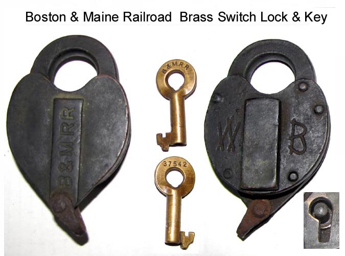 - B&M; RR (Boston & Maine Railroad) incised on rear of shackle, BOHANNAN (worn mostly off) incised shackle front, no chain. Iron switch lock. Key marked B&M; RR, SLAYMAKER, 8681.