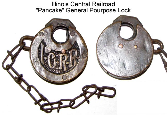 ICGRR, incised back, Keline embossed on dust cover, steel lock with chain. Has brass key marked ICRR (Keyline key). Illinois Central Gulf railroad