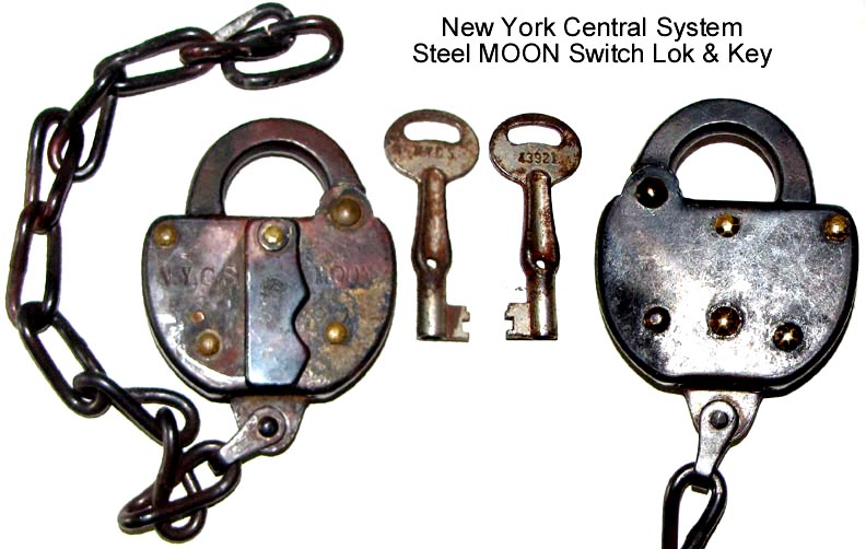 NYCS, MOON incised lock front, CORBIN LOGO incised on dust cover, steel lock with chain. Has steel "oiler" key marked NYCS, 43921. No spring in dust cover or when you unlock the lock. New York Central System railroad