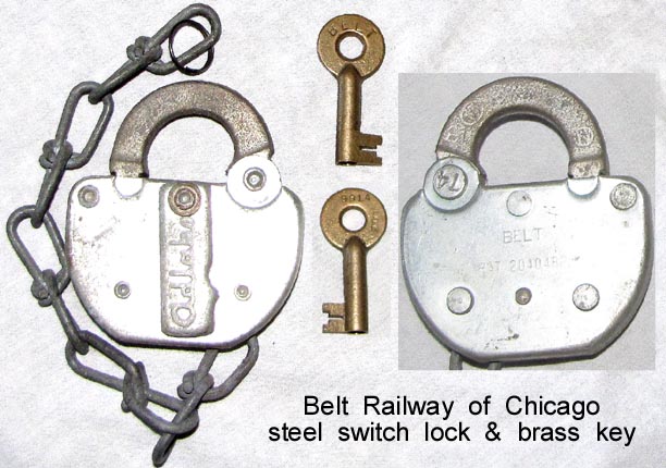 BELT, 74 incised back, ADLAKE embossed on dust cover, steel lock with chain. Has brass key marked BELT, ADLAKE, 8914. Belt Ry of Chicago