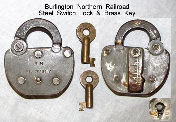 BN, S incised back, ADLAKE embossed on dust cover, steel lock, no chain. Has brass key marked BN INC, ADLAKE. Burlington Northern railroad