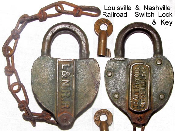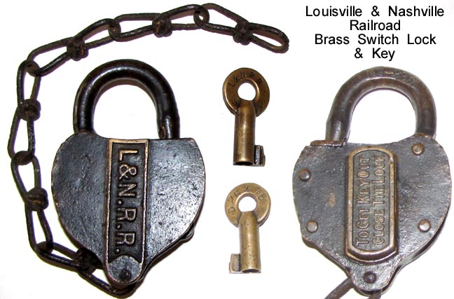 - L&NRR; (Louisville & Nashville Railroad), cast on back panel of lock, TO GET KEY OUT CLOSE THE LOCK cast on dust cover, has chain. Has key marked L&NRR;, D60973. Opens but does not pop open. Main line brass switch lock.