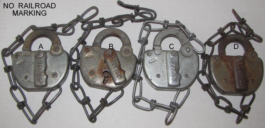 - CCC&STLRR; (Cleveland, Cincinnati, Chicago & St.Louis Railroad cast on back panel, A&W;(hex) incised on drop, main line brass heart shaped lock, no chain, has key CCC&STLRR;, ADLAKE(curved), S, 15970.
