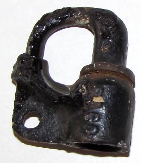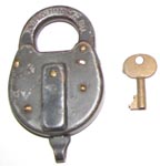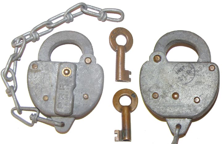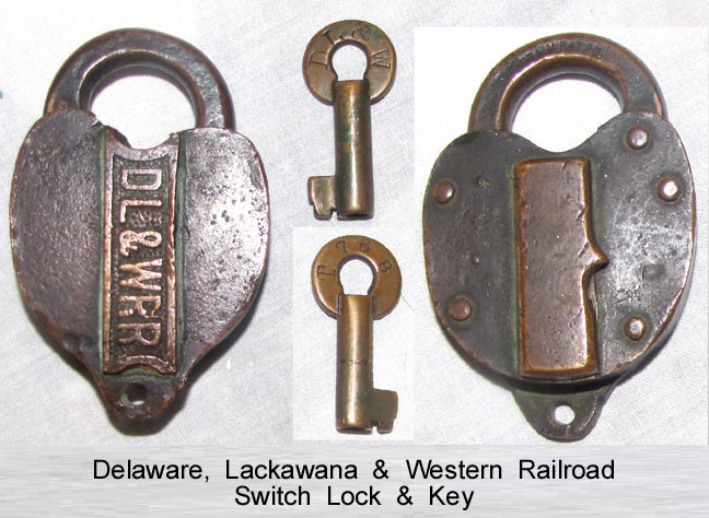 - DL&WRR; (Delaware, Lackawanna & Western Railroad cast on back panel, FRAIM incised on shackle rear, DL&W; incised on shackle front, main line brass heart shaped lock, no chain. Has key marked DL&W; RR, SLAYMAKER, 3388.
