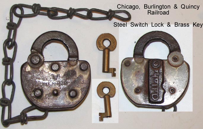 - CM&STPRR; (Chicago, Milwaukee & St.Paul Railroad) cast back panel, no makers mark. No chain. Has later key marked CM&STP;&P;. Nice working brass heart shaped switch lock. Some times you need to turn the key 2 or 3 times but then the lock pops open.