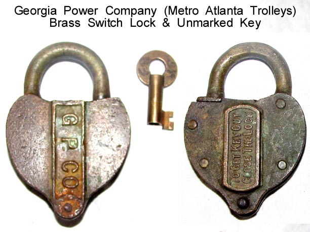 - GPCO cast on back PANEL, TO GET KEY OUT CLOSE THE LOCK cast on dust cover, name changed in 1926 to Georgia Power Co's Atlanta trolley system brass heart shaped switch lock, NO chain, unmarked key opens lock easily (deduct $10 from the price if the key is unwanted).