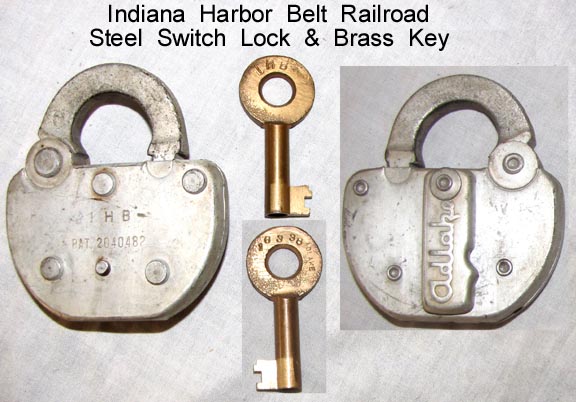 IHB, incised back, ADLAKE embossed on dust cover, steel lock, no chain. Has brass key marked IHB, 16338, ADLAKE. Indiana Harbor Belt railroad
