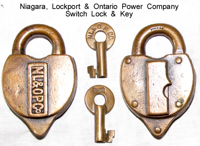 - NL&OPCo; (Niagara, Lockport & Ontario Power Company), cast on back panel of lock, FRAIM incised shackle front, brass lock, NO chain, has key NL&OPCo;, FRAIM (Banner).