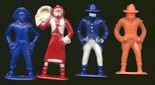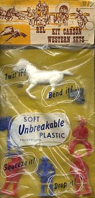 Early 1950s figures may come with swirled plastic and factory paint. Some figures may have yellow paint applied at factory as flesh! Earlier figures (1951-56) are hard plastic while later ones (1957-63?) were made in soft plastic. The stagecoaches, wagons, caissons and cannons were made of hard plastic and can suffer from heat warping after years of storage in attics. We have found the caissons and cannons in soft plastic but are unsure if the wagons were ever made in soft plastic. Plastic Art had a nice line of plastic tea sets and doll house furniture, but the western themed sets seem to have become the companies most popular sellers (at least for boys). The western figures were sold in header bags, small and large boxed sets.