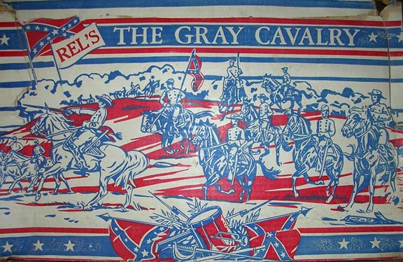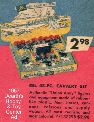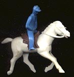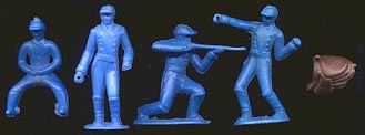 Earlier figures are made of hard plastic and often have a bit of paint applied (yellow as flesh!! seems common). The hard plastic figures can be found in both blue and gray colors and were used in ACW playsets. Most of the soft plastic figures we have seen are blue and were probably sold as plains cavalry. Also pictured above is the generic rubber saddle used with Rel mounted figures.