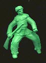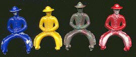 Rel made two generic seated figures to man their wagons and caissons. The driver is wearing a hat while the "shotgun" is holding a shotgun down by his leg. Many fanciful hard plastic swirl color variations exist. We have never seen the soft plastic versions in blue. A dark charcoal gray/black is the most common soft plastic color.