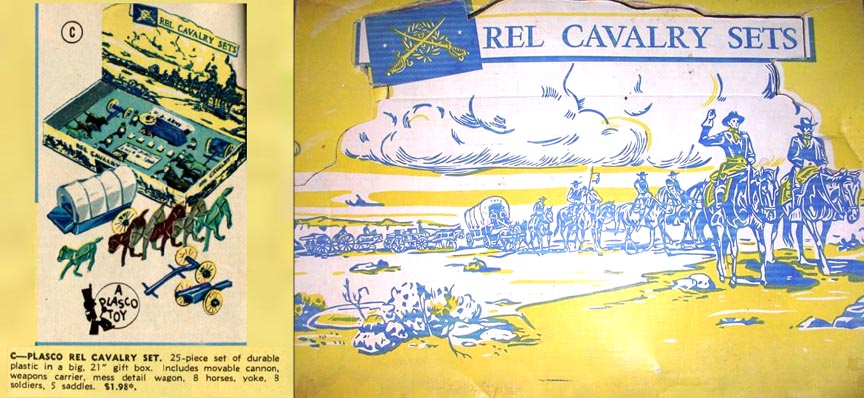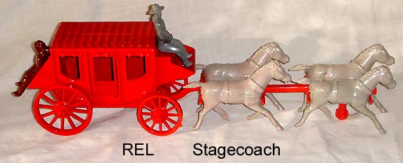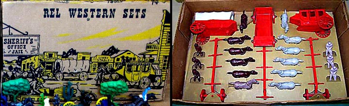 REL PLASTICS was a mold making company that started up in 1948. They made molds for the home, auto and toy industries. To sell the toys from their molds a subsidiary was created, the PLAStic Art Corporation. They compressed the name to PLASCO to use as a marketing slogan. They made and sold tea sets and doll house furniture for girls and western themed figures and playsets for boys. They originally used styrene hard plastic but an ad from a 1957 Dearth's Hobby & Toy center has a western playset touted as being "made of soft, rubber like unbreakable plastic". Other toy companies like Lido Toys and Archer also switched from hard to soft plastic in the mid 1950s as it was safer for children to play with. About 1963 REL stopped making toys to concentrate upon the auto industry. They went out of business in the early 1980s.