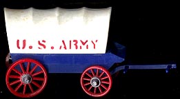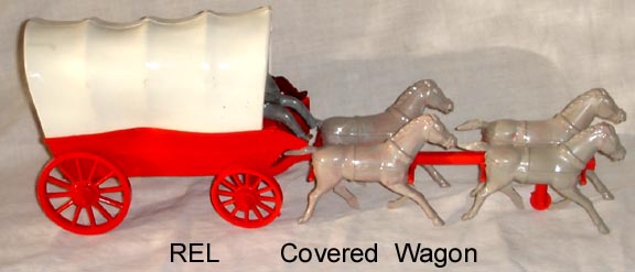 Like the nice Rel stagecoach the wagons front two wheels are attached to the separate wagon tongue. Wagon tongues exist for teams of two or four horses. Wheels were originally held on by "hub caps". This was eventually changed to a wheel with hub extension molded as one piece. Some wagons have words on the covered top (as seen above). The wagons have not fared well over the years as heat tends too warp them. The mold still exists and recasts/reissues have been made since about 1995.