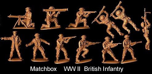 Matchbox WWII British InfantryThis set 12 pose set (2 slight variations of crawling man)usually has two each of the standing shooting rifle, kneeling shooting rifle and charging with rile and one each of the other 9 poses. Original figures were in dark tan ("P" series box), later issues (4000 series boxes) were light tan. Some early sets had figures in pale green.