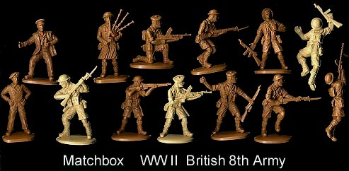 Matchbox WWII British 8th ArmyThis 13 pose set usually came with two each of the crawling with tommygun and prone shooting Bren gun and one each of the other 11 poses. Original ("P" box) figures were dark tan while later (40000 series box) were made in light tan.